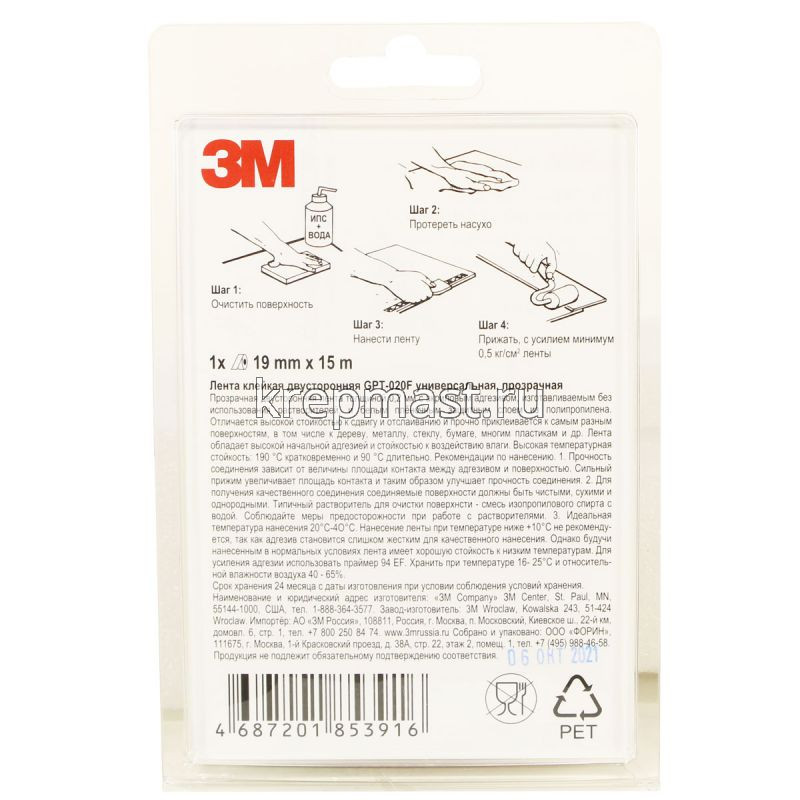 Двусторонняя лента 3М 19 мм х 5 м подходит для применения в различных областях, включая производство бытовой техники, промышленного оборудования, транспортных средств и потребительской электроники, а также изготовление вывесок. Используется для склеивания материалов с высокой поверхностной энергией, а также некоторых материалов с низкой поверхностной энергией (нержавеющая сталь, поликарбонат, алюминий, АБС-пластик, полипропилен и стекло).