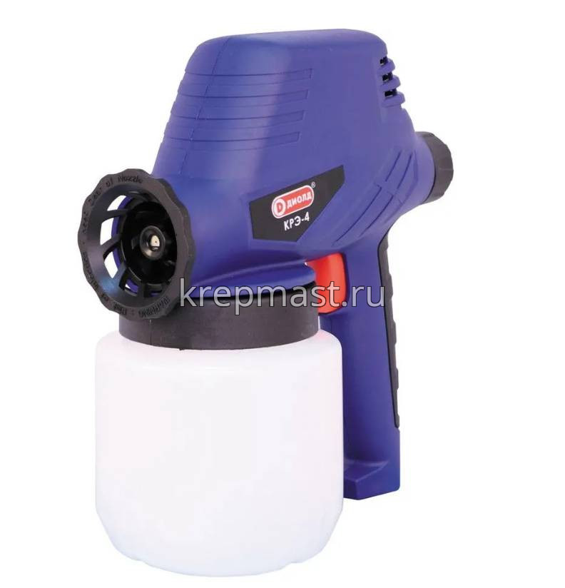 Электрический краскораспылитель ДИОЛД КРЭ-4 предназначен для распыления лакокрасочных, защитных, дезинфицирующих и других жидких материалов. Прост в эксплуатации. Не требует использования отдельного компрессора, что значительно повышает его мобильность. Лепестки сопла имеют три положения, что позволяет формировать конусный, плоский горизонтальный либо плоский вертикальный факел.