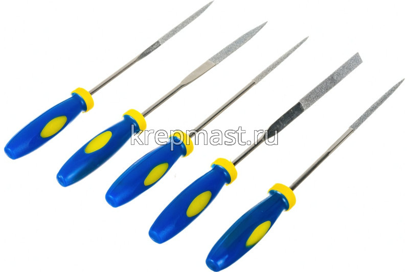 Надфили FIT алмазные, мягкая.рук. 3х140х50мм 5шт - инструменты для обработки металлических заготовок вручную. Рабочие части надфилей изготовлены из легированной стали и имеют алмазное напыление. Пластиковые рукоятки обрезинены для предотвращения выскальзывания инструментов из рук в процессе работы.