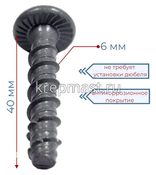 Анкер - шуруп СТВ по бетону 6 х 40 с полукруглой головкой не требует установки дюббеля. Его можно закручивать сразу после засверливания. Снабжён дополнительным антикоррозионным покрытием