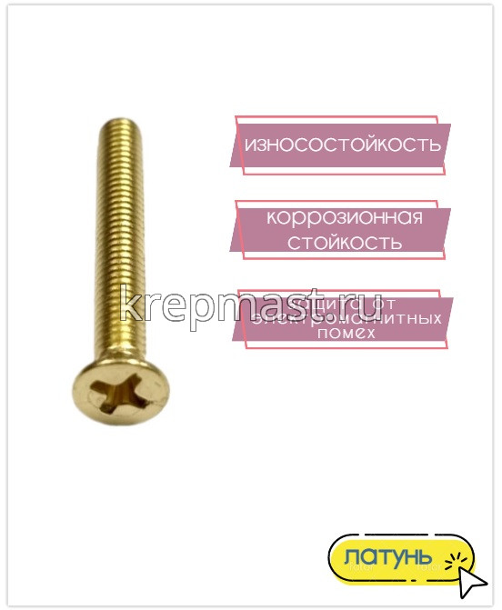 Винт латунный с полукруглой головкой DIN 965 М 4 х 25 используется в случае, когда необходимо создать немагнитный узел. Латунный винт применяется в приборостроении, авиации, атомной промышленности. Латунный крепеж стоек к органическим кислотам и углекислым растворам.