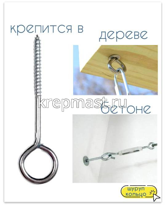 Шуруп-кольцо 6,0 х 80,0применяется для монтажа в бетонные и кирпичные основания с помощью пластиковых дюбелей, а также в деревянные конструкции, в предварительно просверленное отверстие. Шуруп-кольцо используется для монтажа тросов и канатов, фиксации легких строительных лесов и стеллажей к стенам, а также для подвешивания предметов к потолку и стенам.