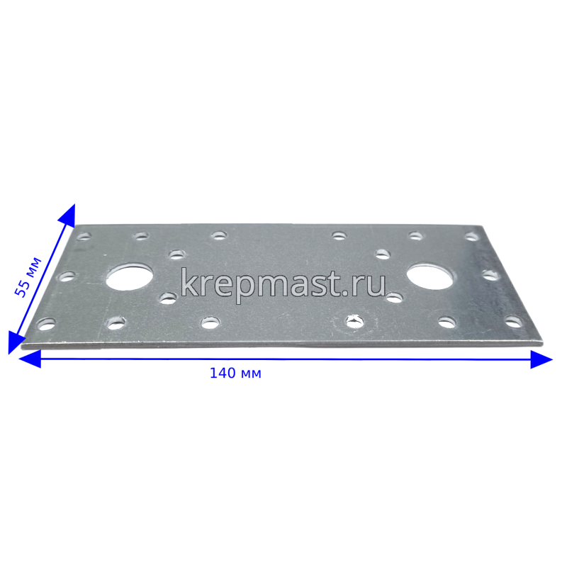 Крепежная пластина LP2 140x55x2 мм применяется для соединения и упрочнения конструкций при помощи нескольких дюбелей, анкеров, саморезов.