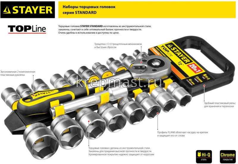 Набор STAYER головок торцевых 1/4" (4-13мм) 12 предметов используется при проведении ремонтных и монтажных работ в автомастерской. Он содержит торцовые головки размером от 10 до 24 мм, трещотку с 45 зубцами и удлинитель. Головки выполнены из закаленной инструментальной стали, обладающей высокой прочностью и твердостью. Благодаря хромированному покрытию инструменты надежно защищены от коррозии.