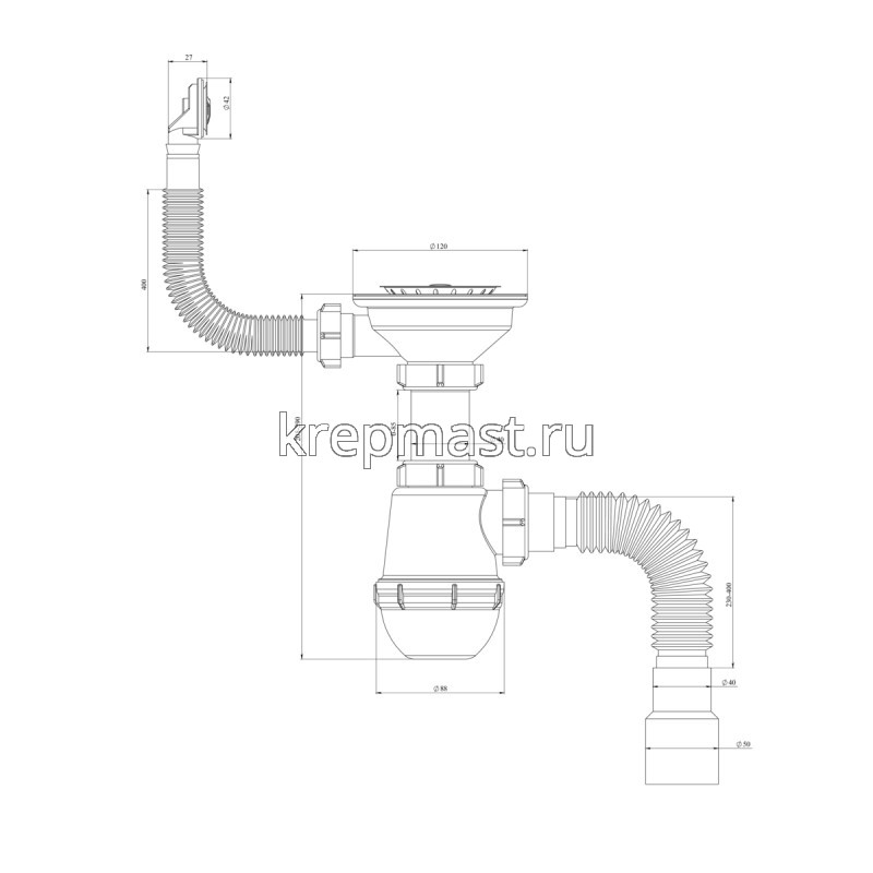Сифон для мойки. Выпуск 1 ? (40), круглый перелив, пластиковый шток, чашка из нержавеющей стали 115, гибкий отвод в канализацию 40х40/50.