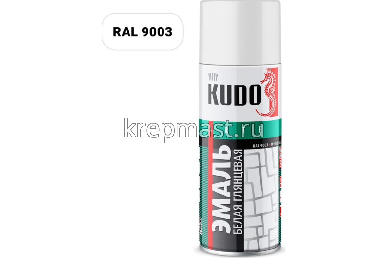 Краска KUDO белая глянец RAL 9003 - высокопрочная универсальная глянцевая аэрозольная эмаль в баллончике, предназначенная для окраски предварительно загрунтованных металлических и деревянных поверхностей. Аэрозольная краска легко наносится на труднодоступные места. Образует долговечное покрытие с хорошей укрывистостью, атмосферостойкостью, превосходной адгезией к окрашиваемой поверхности. Применяется для наружных и внутренних работ.